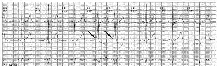 PR间期正常,QRS波群增宽,有预激波。预激综合征室上性心动过速发作时,预激表现大多消失,心电图表现为QRS波群形态正常的室上性心动过速。并发房扑或房颤时,QRS保持预激特征的不少见,心电图表现为QRS波群畸形宽大的房扑或房颤;心室率大多超过200次/分,甚至可达300次/分。房扑时可呈1:1房室传导,并可能辨认房扑波。房颤时心室律不规则,长间歇之后可见到个别QRS波群形态正常(可能为旁路不应期延长,房室结内隐匿传导作用消失后,冲动全部或大部经房室结传导所致),并可能辨认房颤波。心室率极快时,还可伴有频率依赖性心室内传导改变。