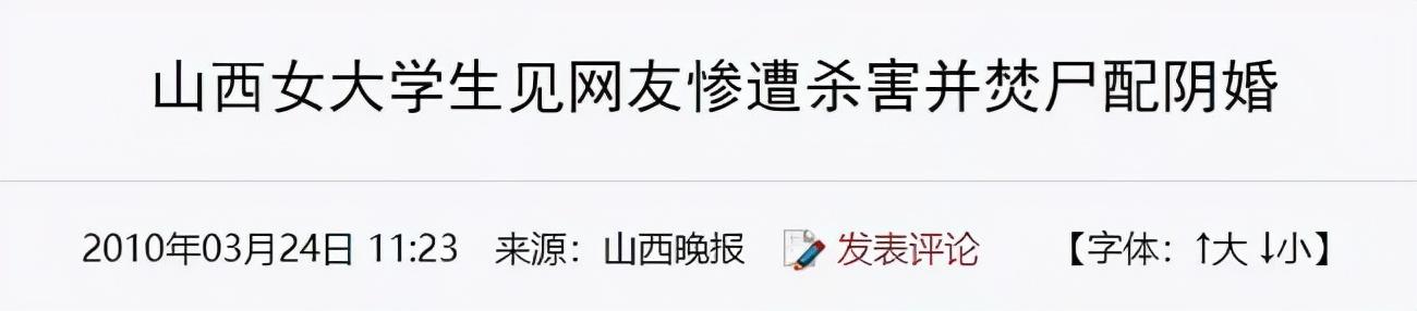 2010年,山西大同男性,为了2万元将大三女学生张某残忍杀害,并焚尸配阴婚。