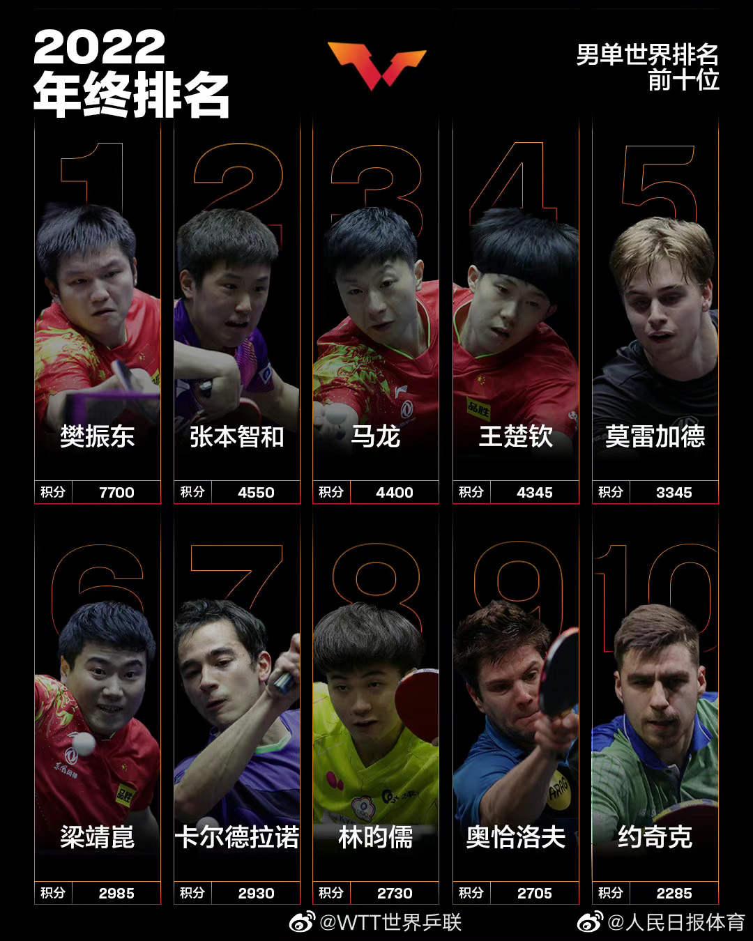 孙颖莎成首位00后年终世界第一(孙颖莎个人世界排名) 2022-12-29 热点新闻 8992 作者:网友投稿 国际乒联2022年终世界排名出炉,中国队小将孙颖莎以8270分收获了自己职业生涯的第一个年终世界第一,这也是00后选手第一次拿到年终第一的成绩。恭喜!