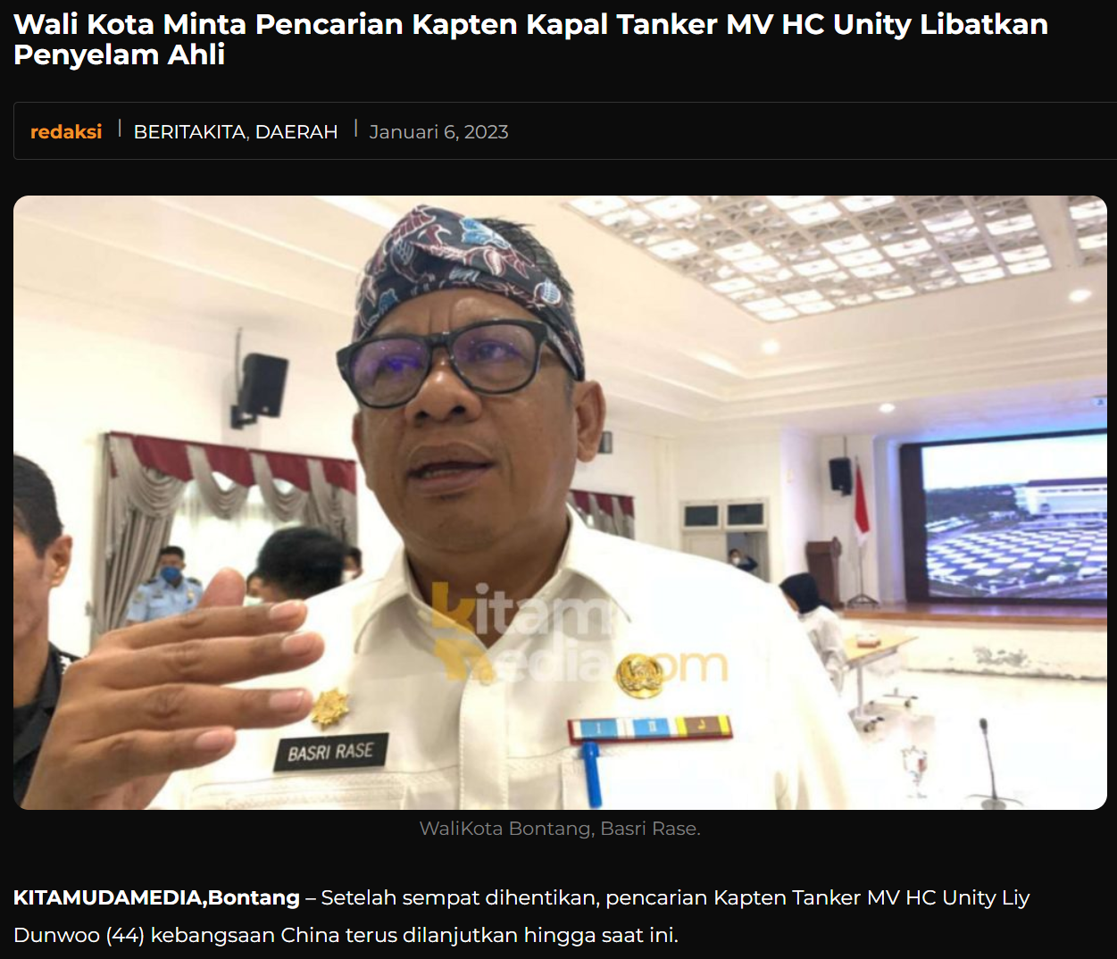 据印尼媒体1月6日报道,邦坦市(BONTANG)市长巴斯里(音译)表示,在过去10天里,“我们在船只上面检查过,也在海里检查过,我们从来没有在船体下面检查过。这只船很大,谁知道有没有卡在船只下面。”